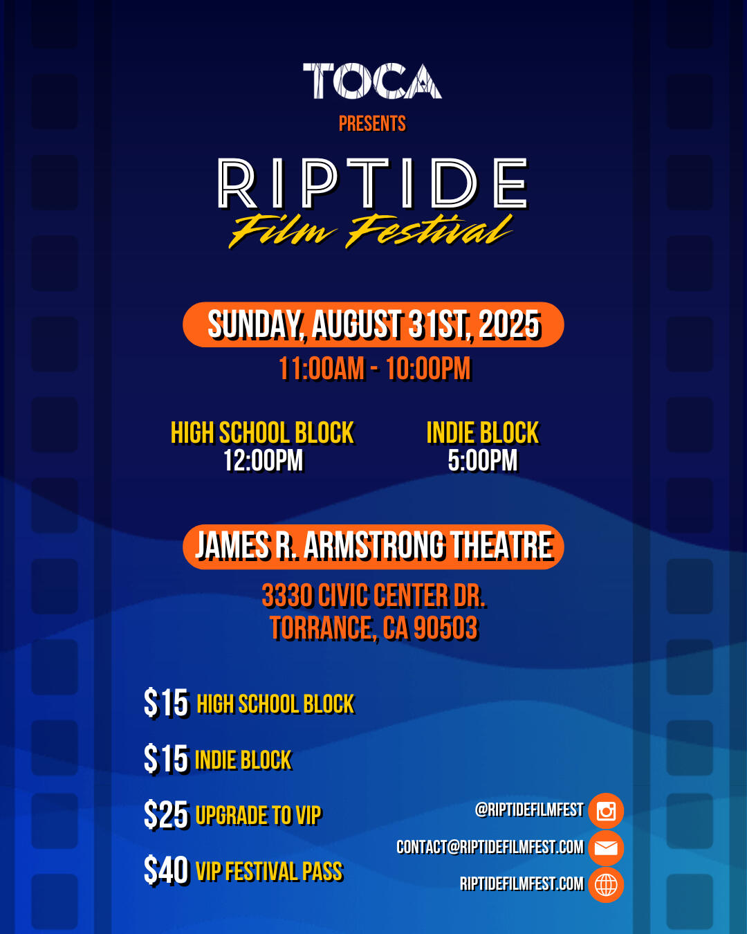 Join us in celebrating creativity, innovation, and the next generation of storytellers. The Riptide Film Festival brings together passionate filmmakers, industry professionals, and film lovers for a one-of-a-kind cinematic experience—where fresh voices shine and bold ideas take center stage.By becoming a sponsor, you’re not just supporting an event—you’re investing in the arts, in local talent, and in the power of storytelling. Your partnership helps us provide emerging filmmakers with a platform to share their work, connect with audiences, and take their careers to new heights.